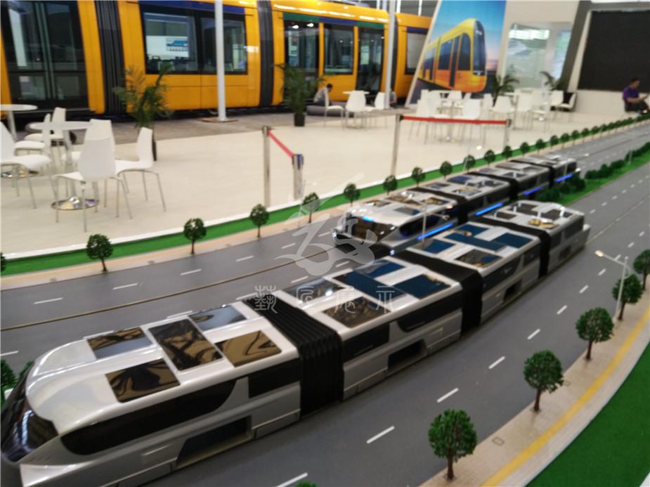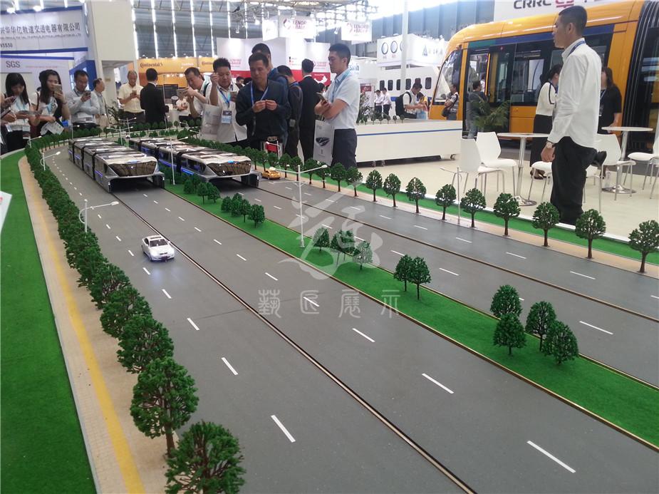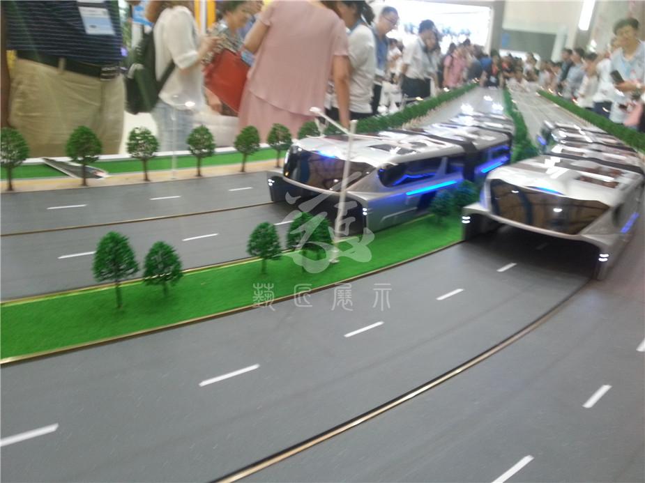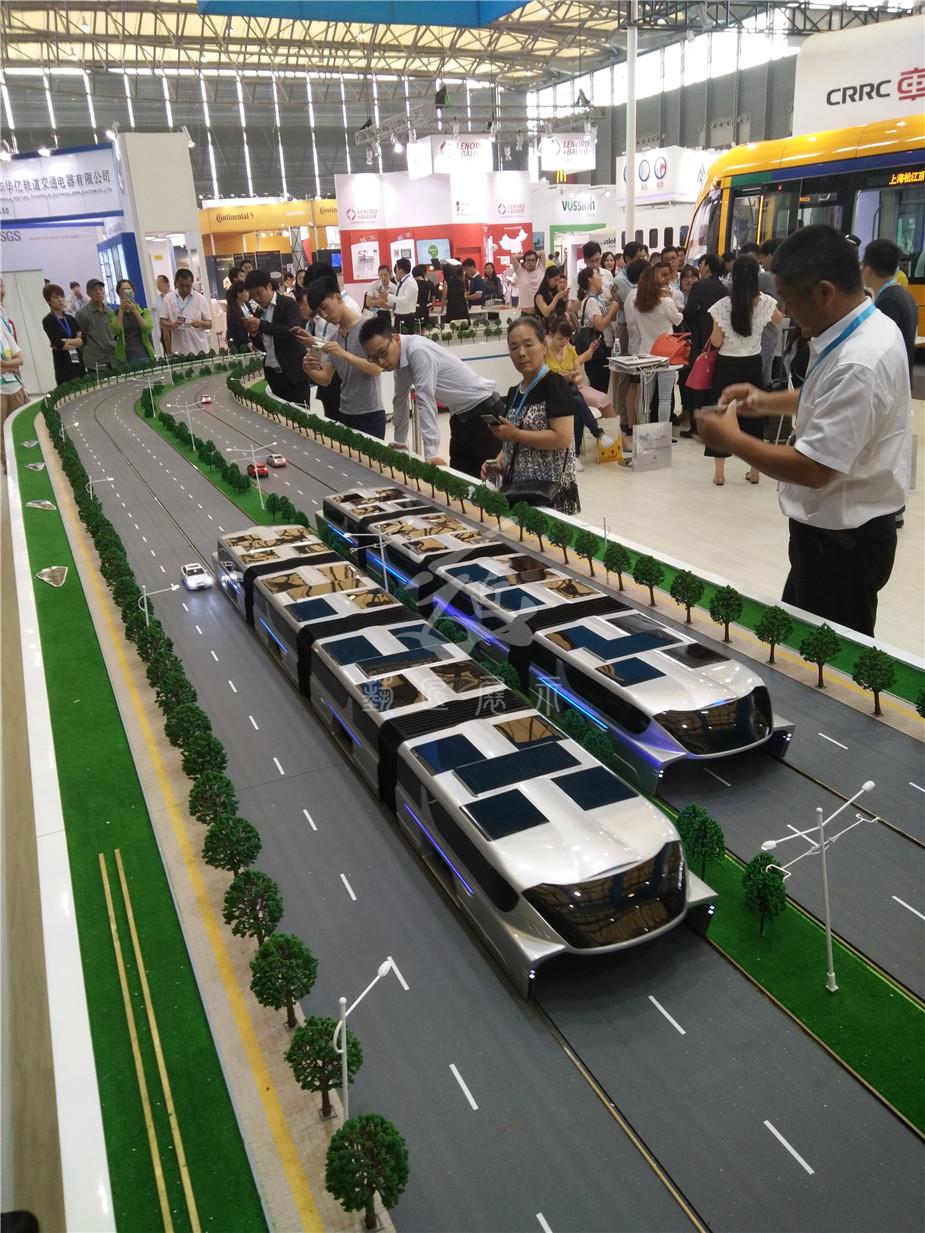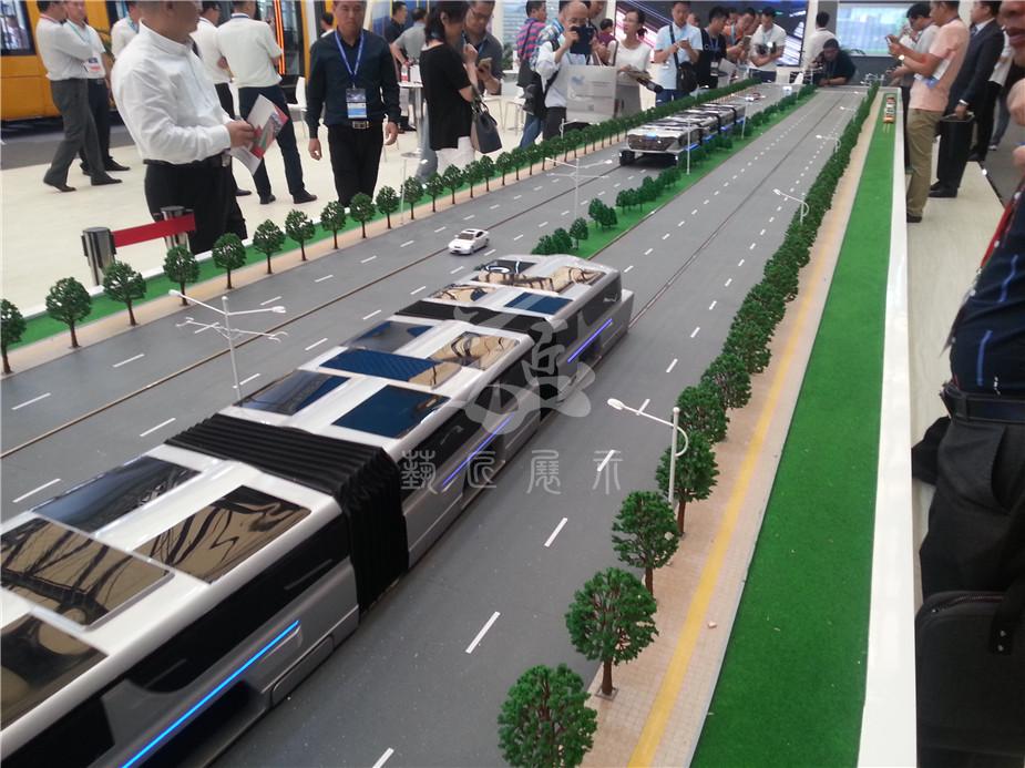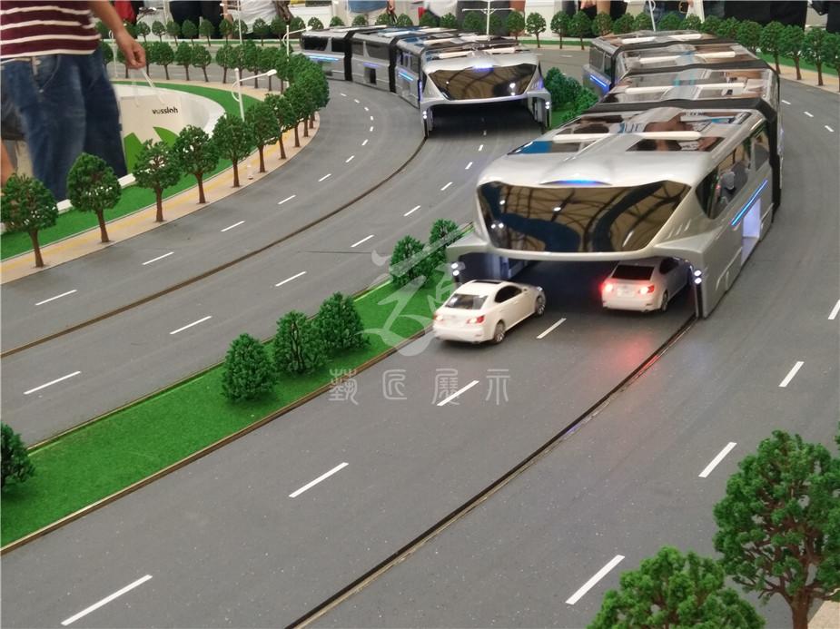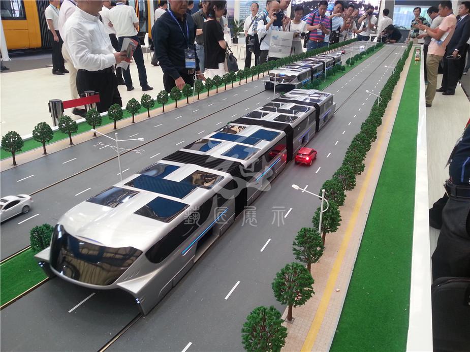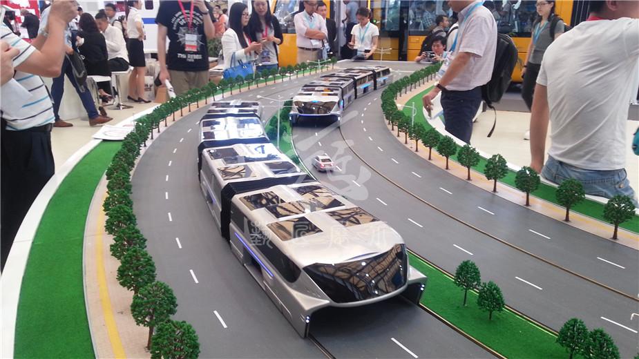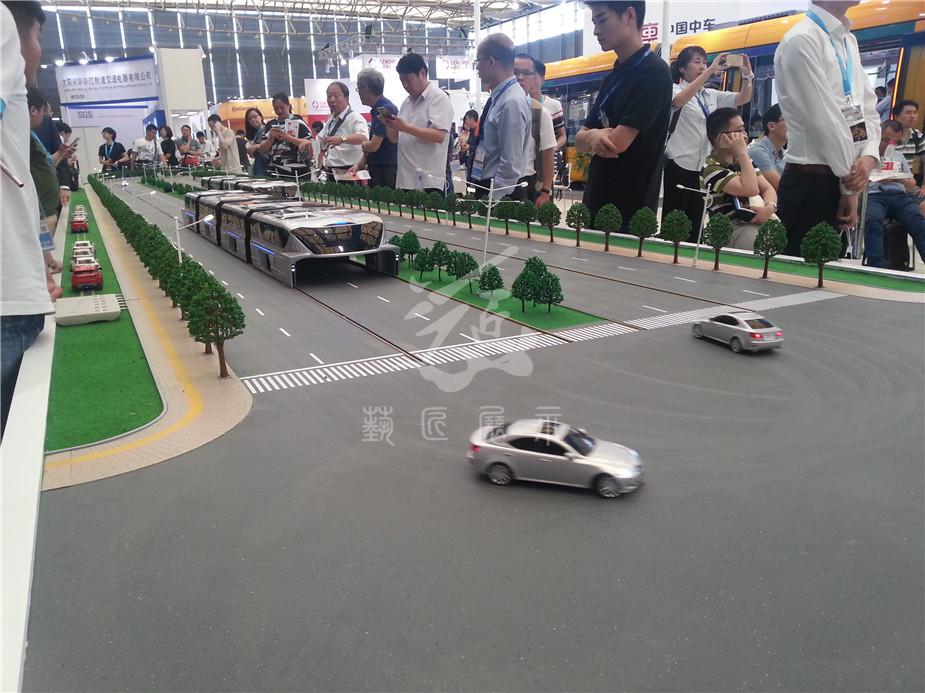 在200多平方米的沙盤上,一輛巴鐵模型車正在快速運行,這輛車上層載客,下層鏤空,馬路上的小汽車在它的“肚子”里自由穿行。