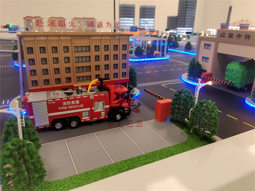 5、消防車行駛至火災(zāi)樓棟,并停留一定時間,紅色燈光熄滅,煙霧停止,消防車自動復(fù)位。